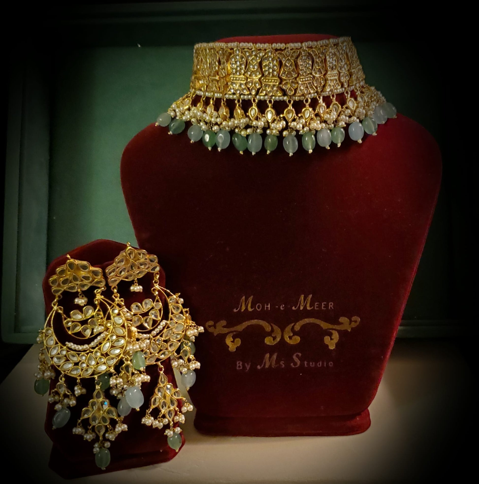 Experience regal elegance with the "Meher-un-Nissa" Set, designed for the modern empress. This exquisite ensemble showcases a broad kundan choker adorned with delicate green bead tassels, perfectly complementing the crescent-shaped chandbali earrings. Each piece reflects meticulous craftsmanship, blending traditional artistry with contemporary style for a statement look that commands admiration.