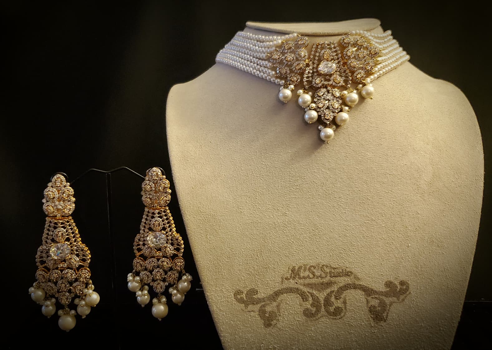 This exquisite choker necklace, strung with lustrous pearls and adorned with intricate crystal work, embodies refined elegance. Complemented by matching ornate earrings, the set effortlessly enhances a regal ensemble, perfect for formal occasions where grace and sophistication are paramount. Designed for those who appreciate timeless craftsmanship, this jewelry set balances delicate detailing with a commanding presence.