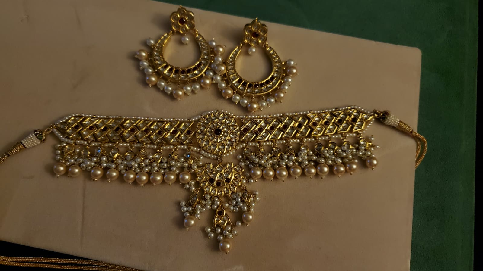 The Taj-e-Moti Set combines delicate pearls with rich gold to create an exquisite choker and matching earrings. Its intricate patterns showcase traditional craftsmanship, adding timeless elegance and cultural depth to your attire. Perfect for special occasions, this set offers a harmonious blend of refined beauty and artisanal detail.